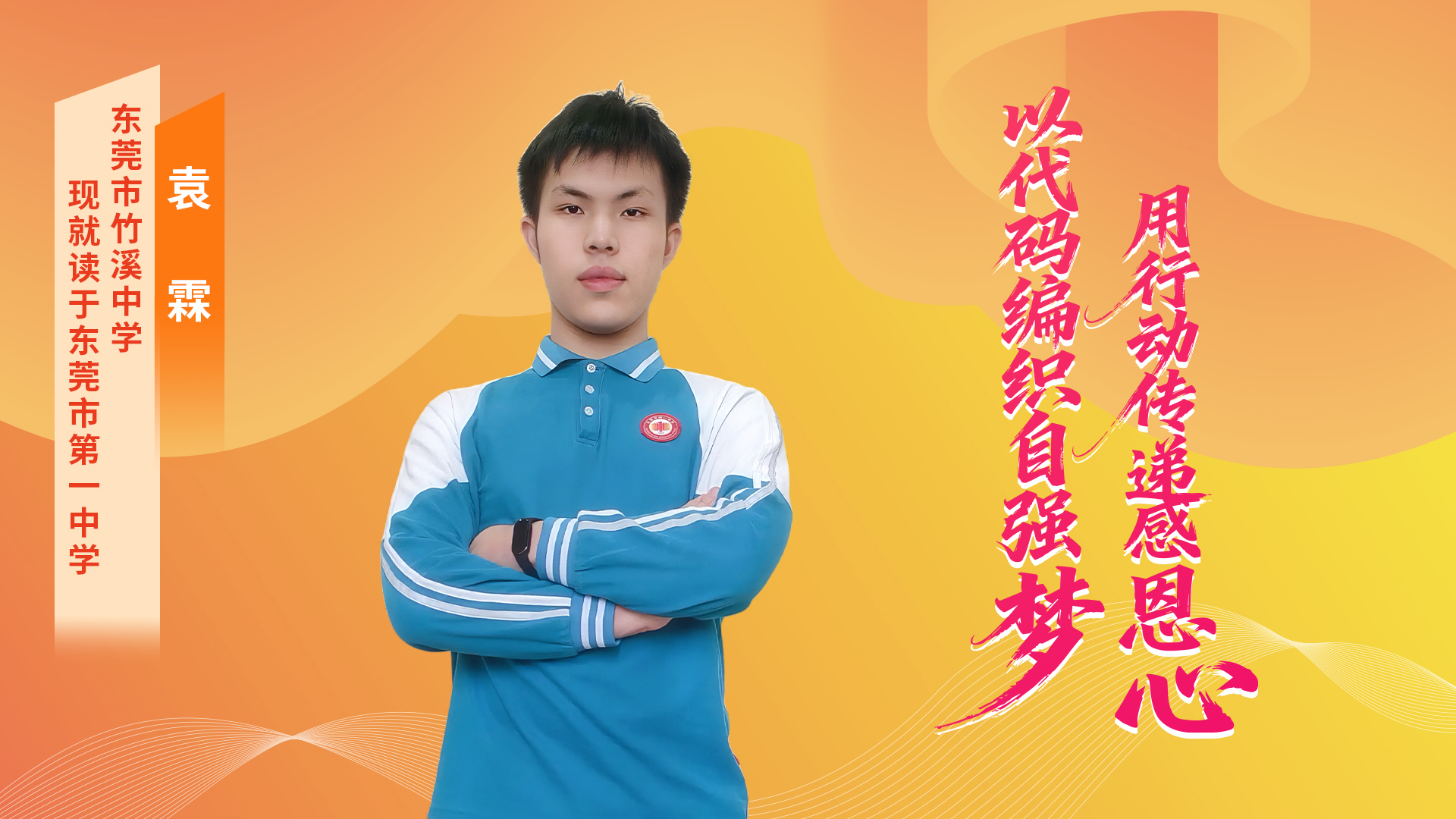 袁霖,男,东莞市第一中学高一年级学生。他幼年听力受损,在政府与社会关爱下重获聆听世界的能力。他自强不息,品学兼优,在信息学编程领域展现出卓越天赋。其科创项目《基于物联网的海洋智能生态馆》获东莞市青少年科技创新大赛一等奖;先后获得第十三届蓝桥杯全国软件大赛广东赛区C++组优秀奖、CCF CSP-J入门级第一轮二等奖等多项奖项。2023年荣获广东省“南粤最美少年·自强好少年”称号,并于2025年入选广东“新时代好少年”先进事迹发布名单。